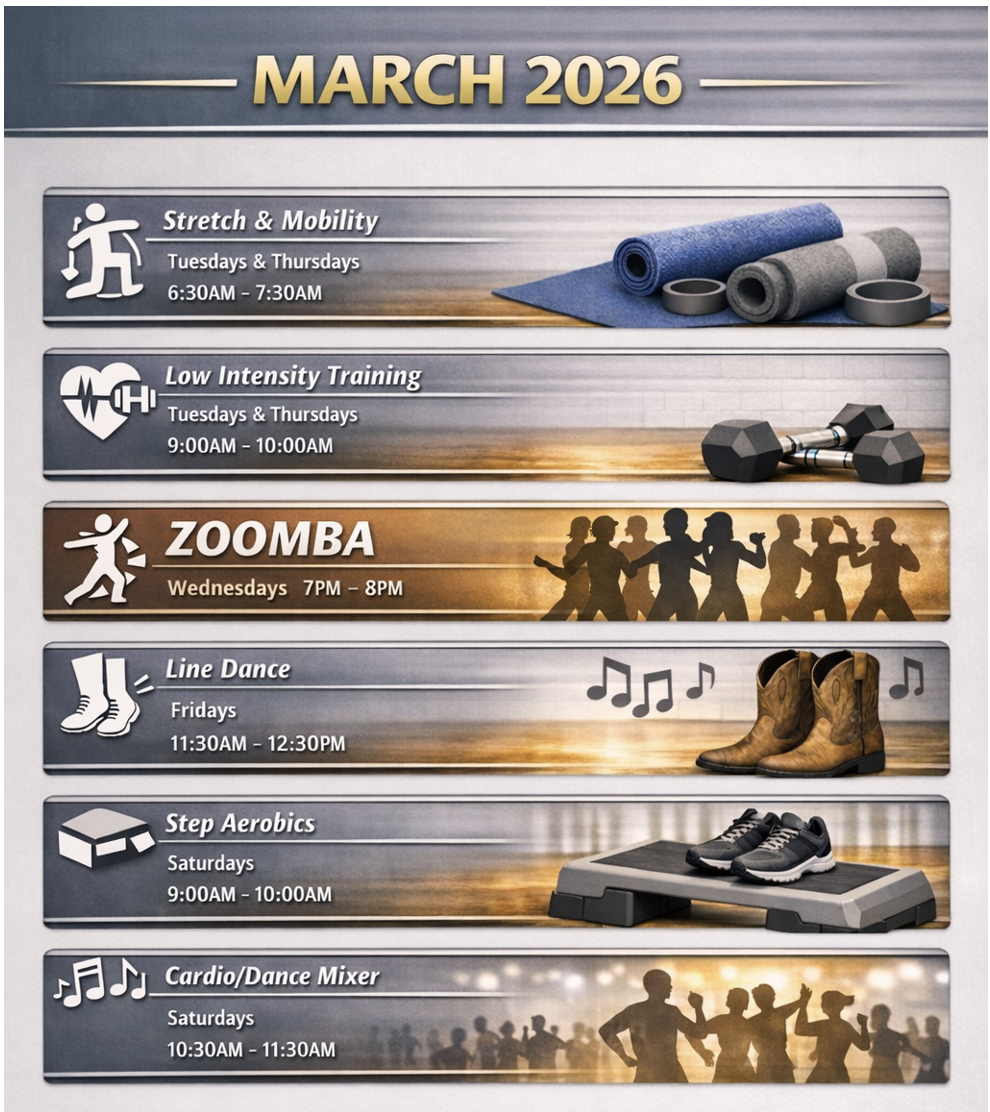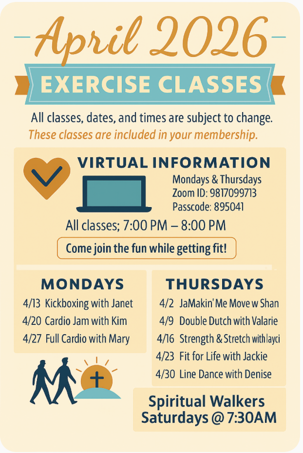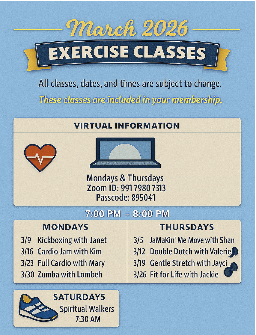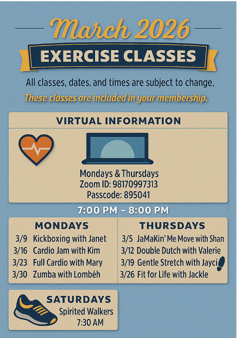 Classes include but are not limited to cardio weights, kickboxing, chair aerobics, Jamakin’ Me Move, Zumba, jump roping, line dancing, walking and more.