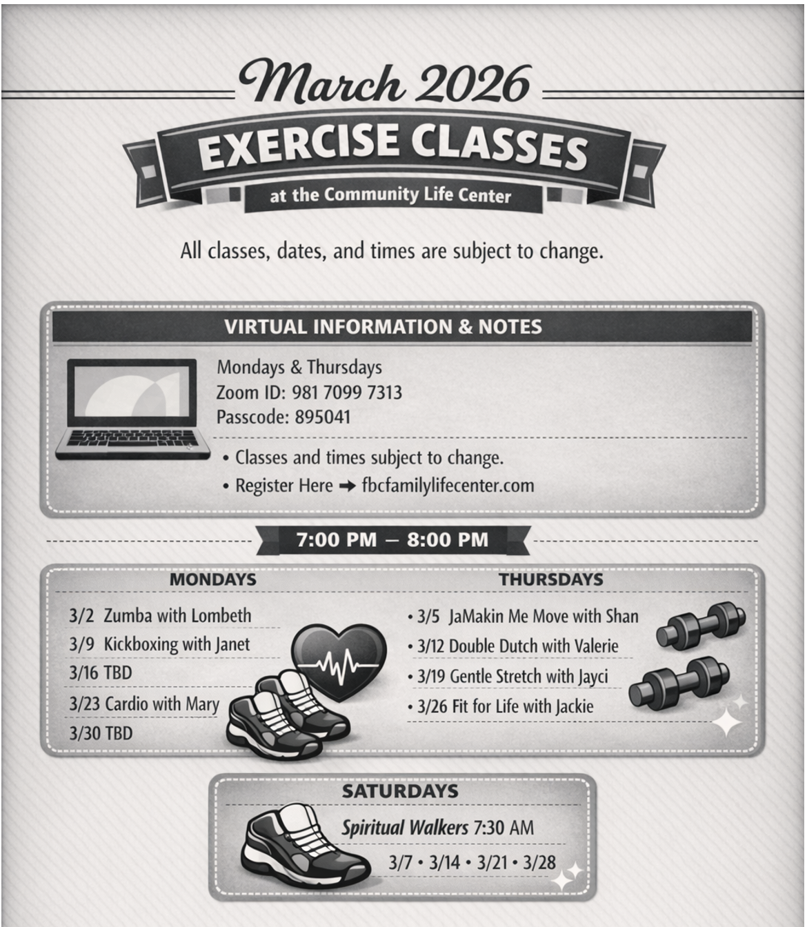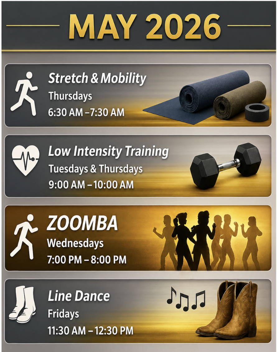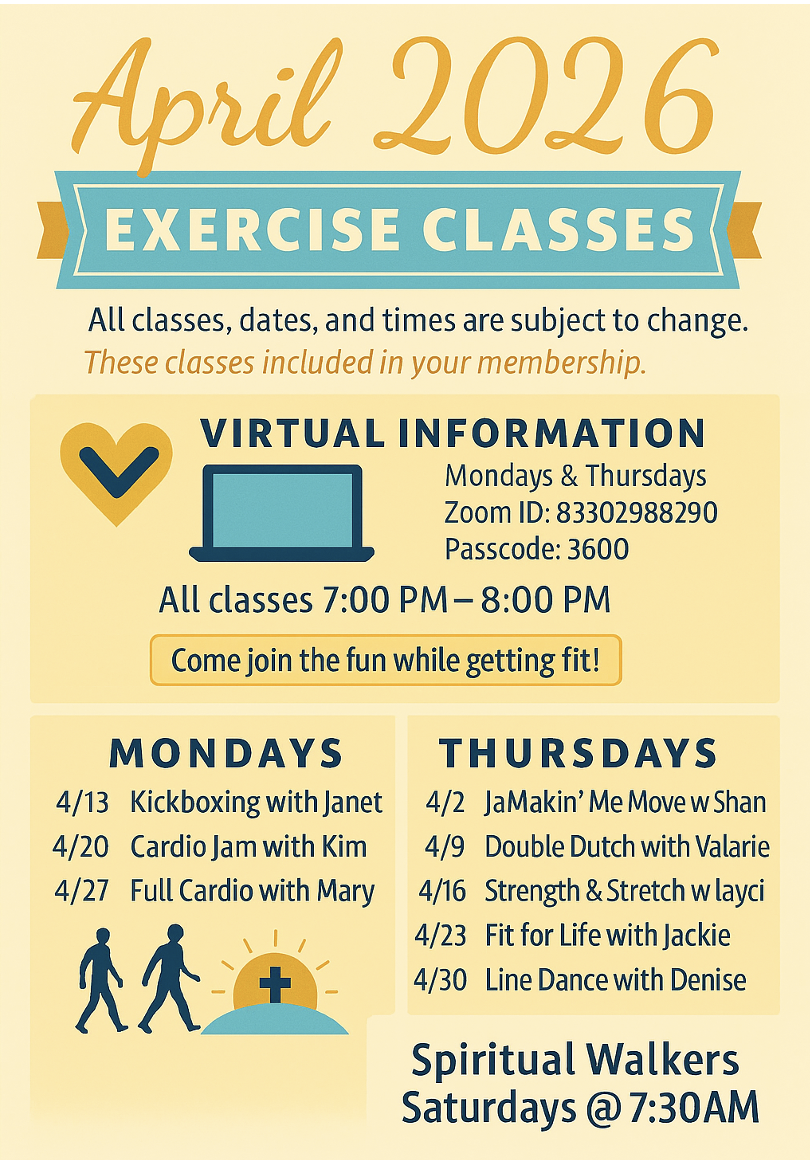 Fitness Classes Mondays and Thursdays @ 7pm (See calendar below)