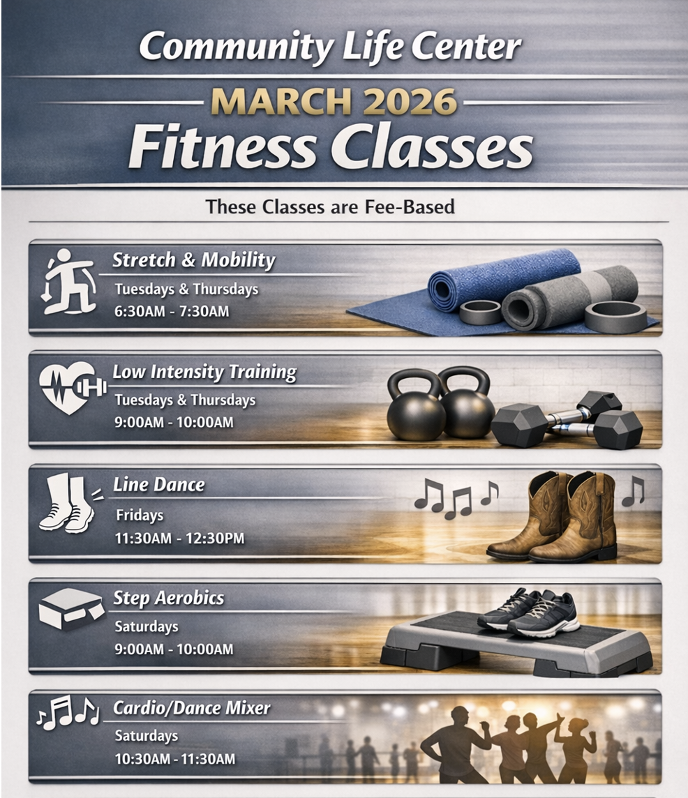 Classes include but are not limited to cardio weights, Pilates, kickboxing, chair aerobics, Jamakin’ Me Move, Zoomba, jump roping, line dancing, Salsa, walking, and more.